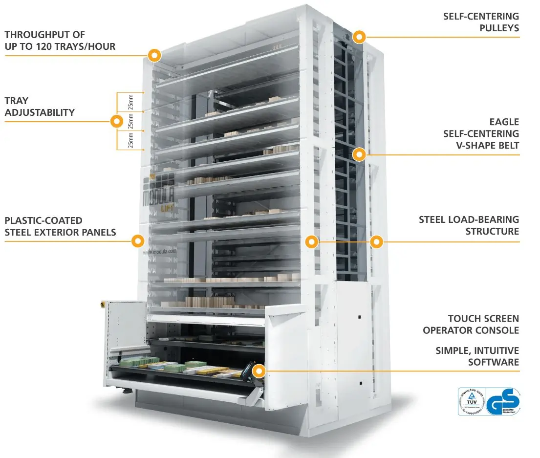 Modula Vertical Lift Modules (VLMs) offer an efficient automated storage solution that helps businesses overcome space and inventory challenges. These systems save up to 90% of floor space,optimize inventory management, and enhance workflow efficiency through automated vertical storage. With a push-button interface, they streamline access to materials, reduce picking errors, and support scalable warehouse operations—making them ideal for industries seeking smart automation solutions.
